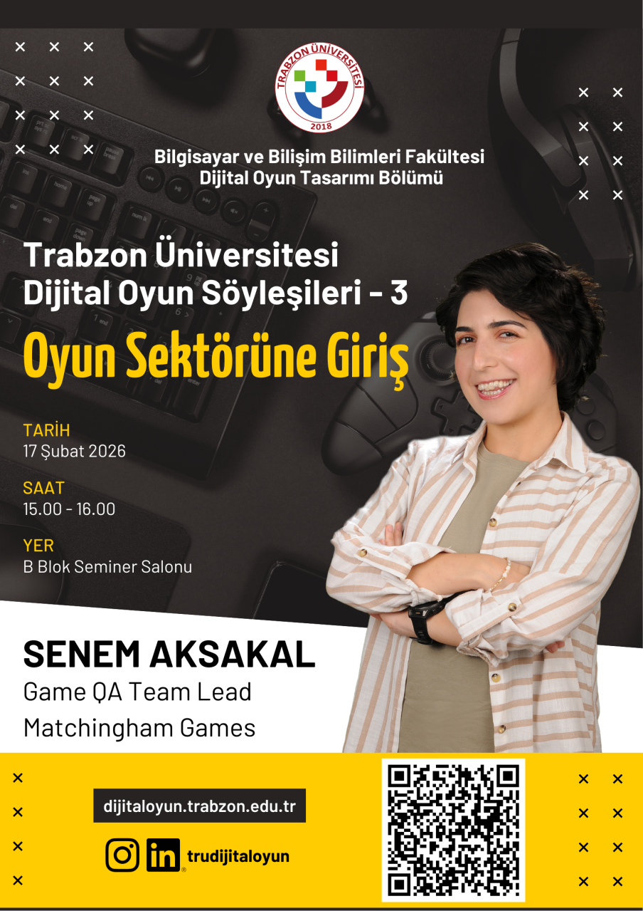 Trabzon Üniversitesi Bilgisayar ve Bilişim Bilimleri Fakültesi Dijital Oyun Tasarımı Bölümü tarafından düzenlenen etkinlik serisinin üçüncüsü, sektörün deneyimli isimlerinden Sayın Senem Aksakal’ın katılımıyla gerçekleştirilecektir.