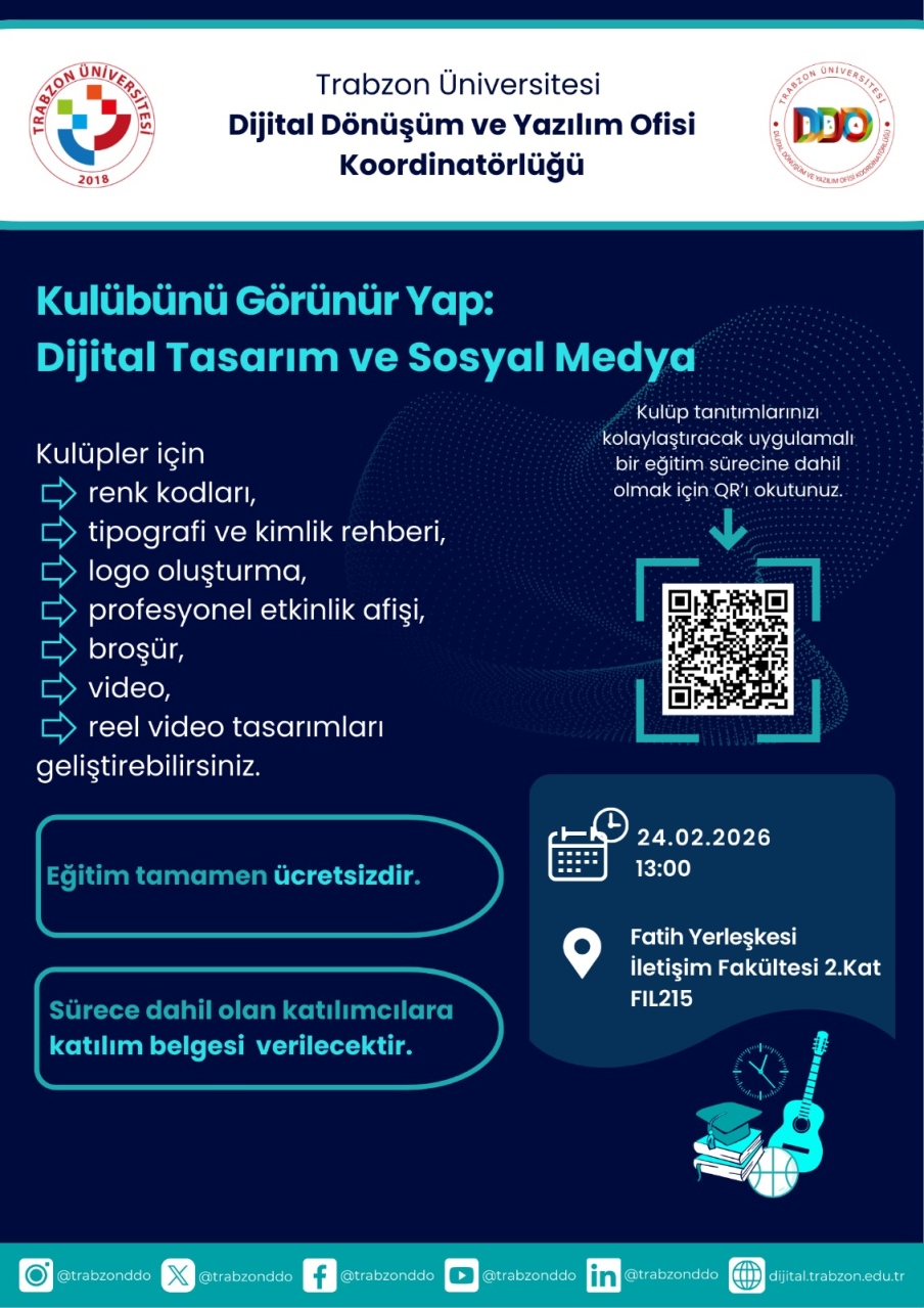 Dijital Dönüşüm ve Yazılım Ofisi Koordinatörlüğü kulüp öğrencilerine yönelik “Kulübünü Görünür Yap: Dijital Tasarım ve Sosyal Medya” başlıklı bir eğitim programı düzenleyecektir. Söz konusu eğitim, 24 Şubat 2026 tarihinde, 13.00-15.00 saatleri arasında Fatih Kampüsü İletişim Fakültesinde bulunan FIL215 isimli laboratuvarda gerçekleştirilecektir.