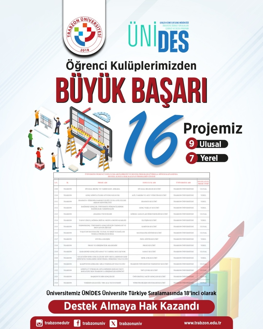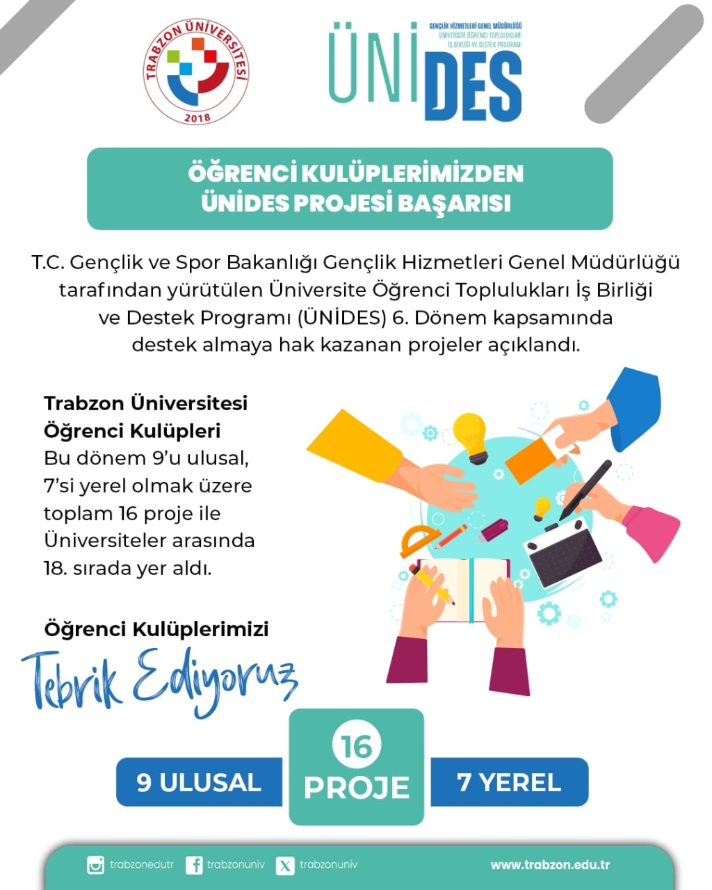 Üniversitemiz ÜNİDES 6. Dönem kapsamında bir büyük başarı daha elde etti. Gençlik ve Spor Bakanlığı Gençlik Hizmetleri Genel Müdürlüğü tarafından yürütülen Üniversite Öğrenci Toplulukları İş Birliği ve Destek Programı (ÜNİDES) projeleri sürecinde Trabzon Üniversitesi olarak öğrenci kulüplerimizin yürüttüğü yenilikçi ve toplumsal katkı odaklı 16 proje destek almaya hak kazandı. Desteklenen bu proje sayısı ile TRÜ üniversiteler arasındaki genel sıralamada ülke çapında 18. sırada yer alırken, Rektörümüz Prof. Dr. Emin Âşıkkutlu destek almaya hak kazanan tüm kulüpleri ve öğrencileri tebrik ederek şunları söyledi: